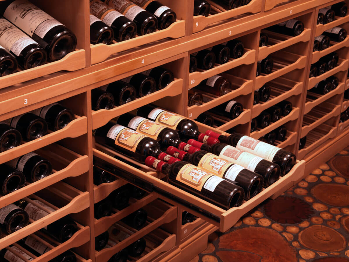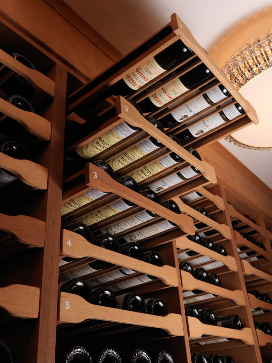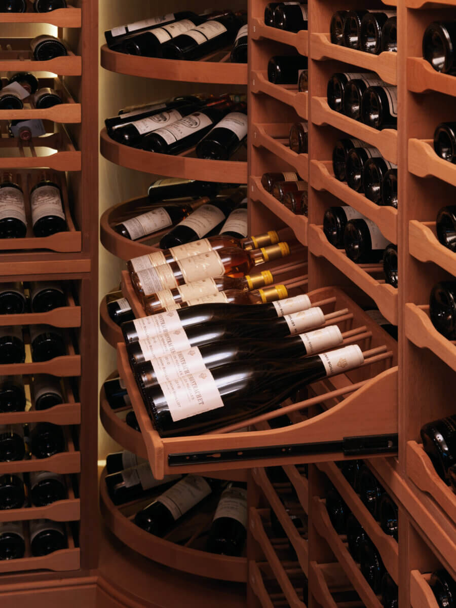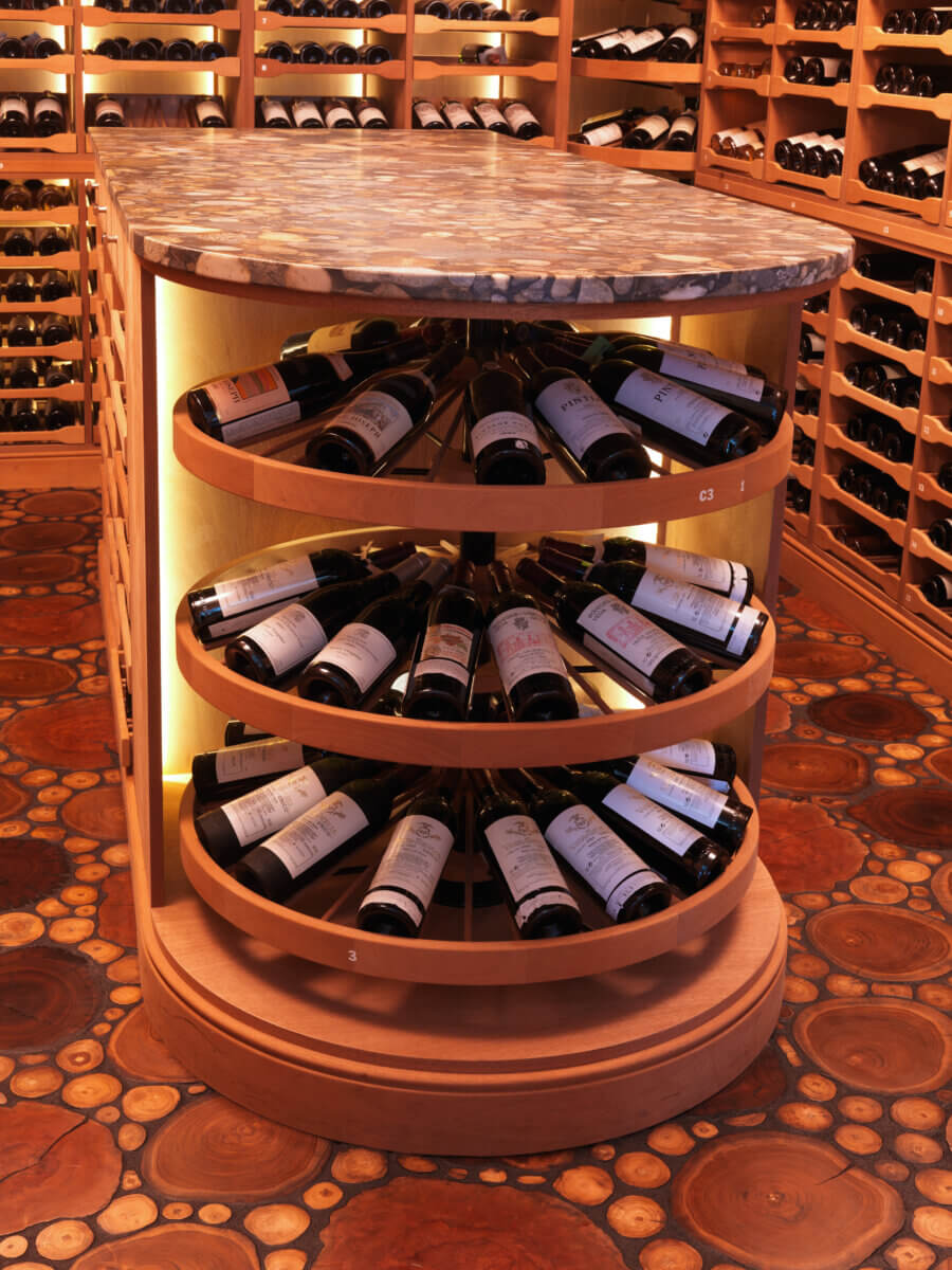 Two separate wine cellars, on the 42nd and 43rd floor of his apartment feature Revel’s classic sliding pullout wine drawers with LED lighting and rotating wine storage towers. Getting materials in and out of the high-rise building proved challenging, but the end result was an elegant, accessible wine cellar that houses around 2,700 bottles.