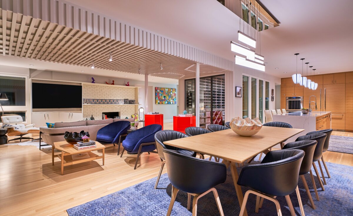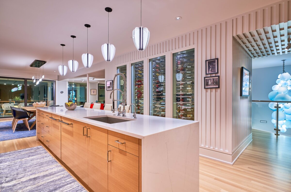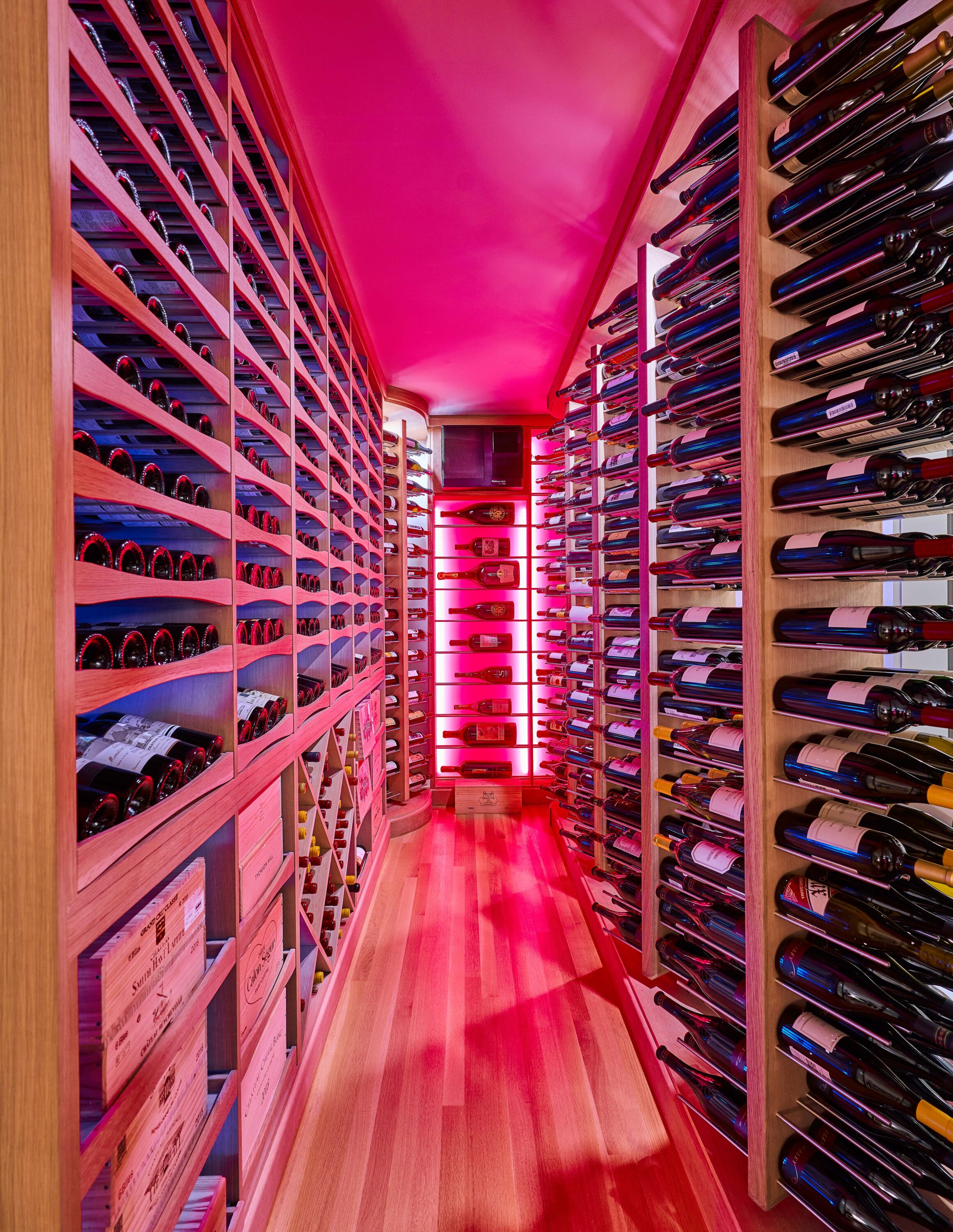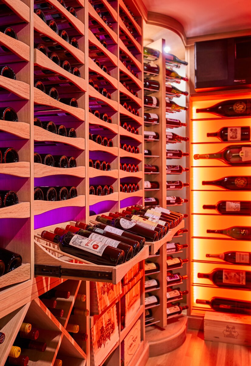This North Carolina statement wine cellar with views from outside, is situated in the heart of the entertainment zone. It was part of a collaboration with Kersting Architecture, True Builders, and Revel. The color LED lighting casts an enchanting glow as the colors move and change in tone and intensity. The storage elements include our rotating Revel-ution wine towers, sliding pullout drawers, large format wine ladders and case storage.