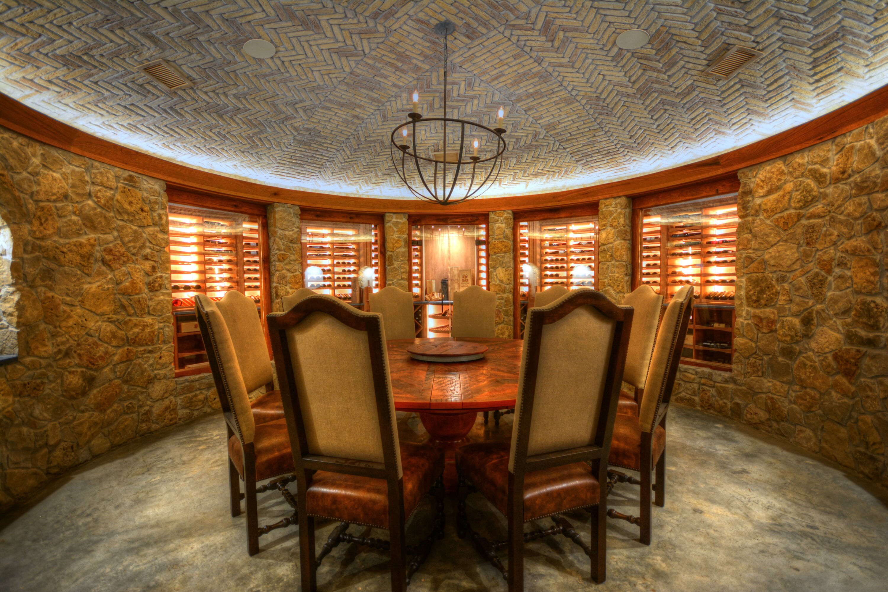 This semi-circular Houston, Texas wine cellar partially surrounds a magnificent tasting room in Navasota, Texas. Warm, rich mahogany wine cabinetry contrasts with the natural stone and herringbone brick that line the floors, walls and ceiling of the wine room.