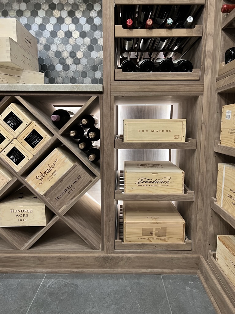 This cellar offers storage for over 1,000 bottles, combining Revel’s signature pullout drawer technology with soft LED lighting, frameless glass doors, and furniture-grade walnut cabinetry. The angled displays showcase prized bottles while ensuring ideal cork contact and aging conditions.