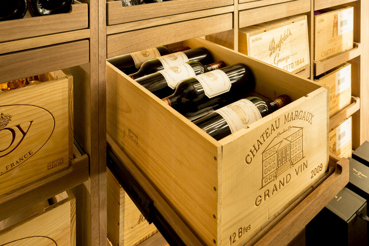 Upon entering the cellar from the adjacent tasting area, your eyes are drawn to a custom-made wine storage piece with a marble top that artfully displays both wine and a collection of decanters. On either side of this space are two separate wine cellars. Majestic 10′ high wine wheel towers and copper studded Revel-ution towers anchor each wine room, along with sliding pullouts and a 3-bottle wide wine ladder.