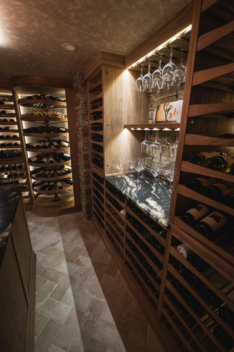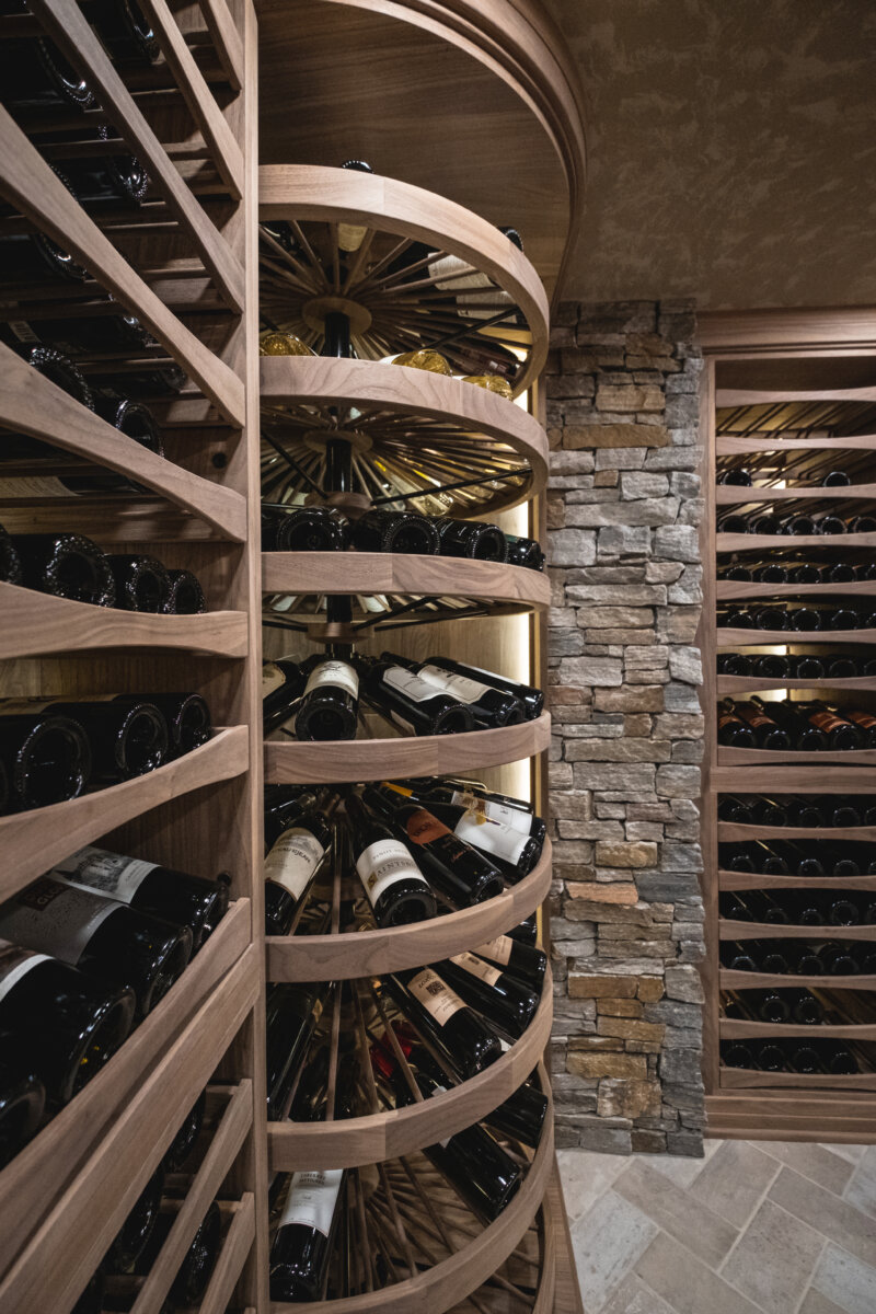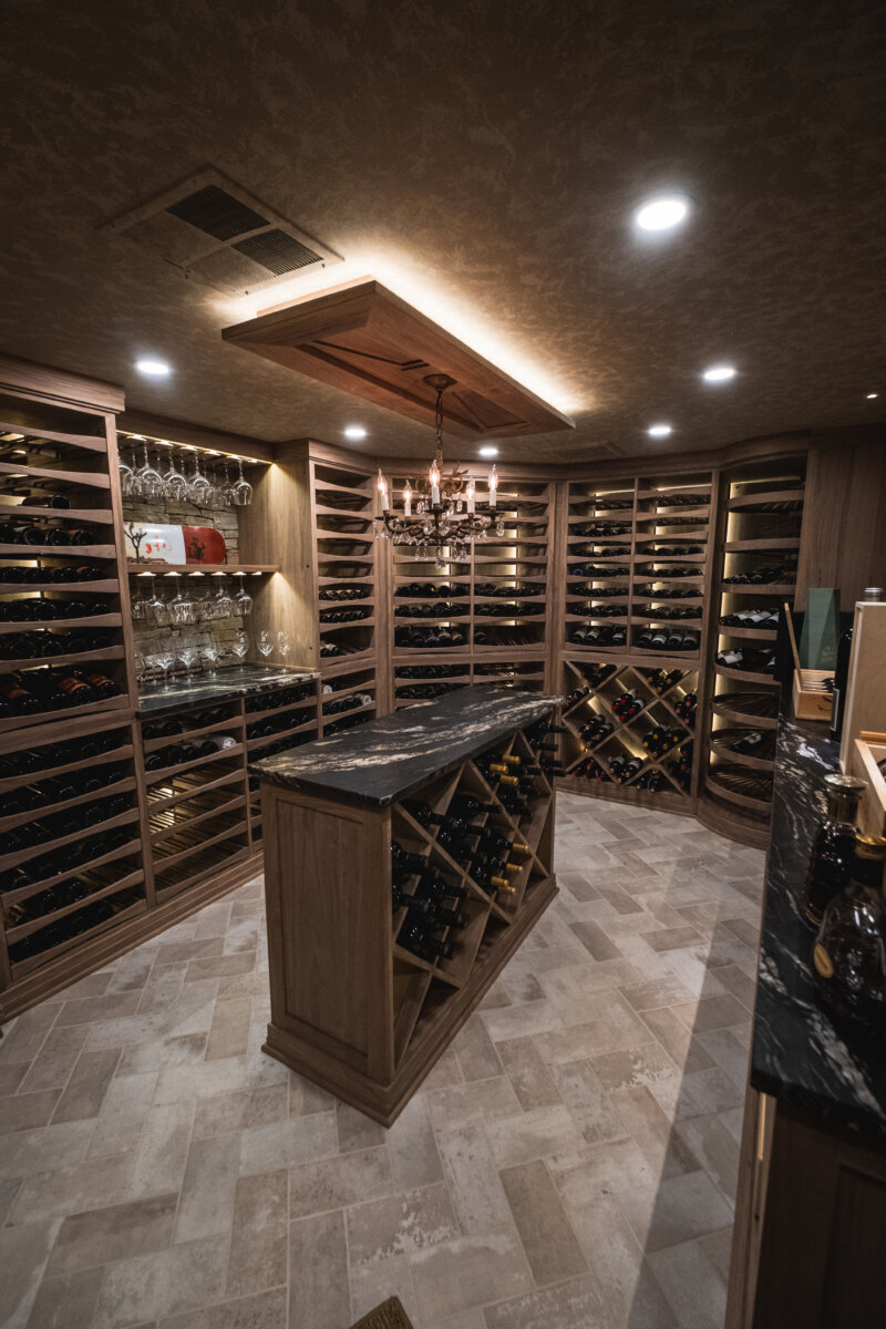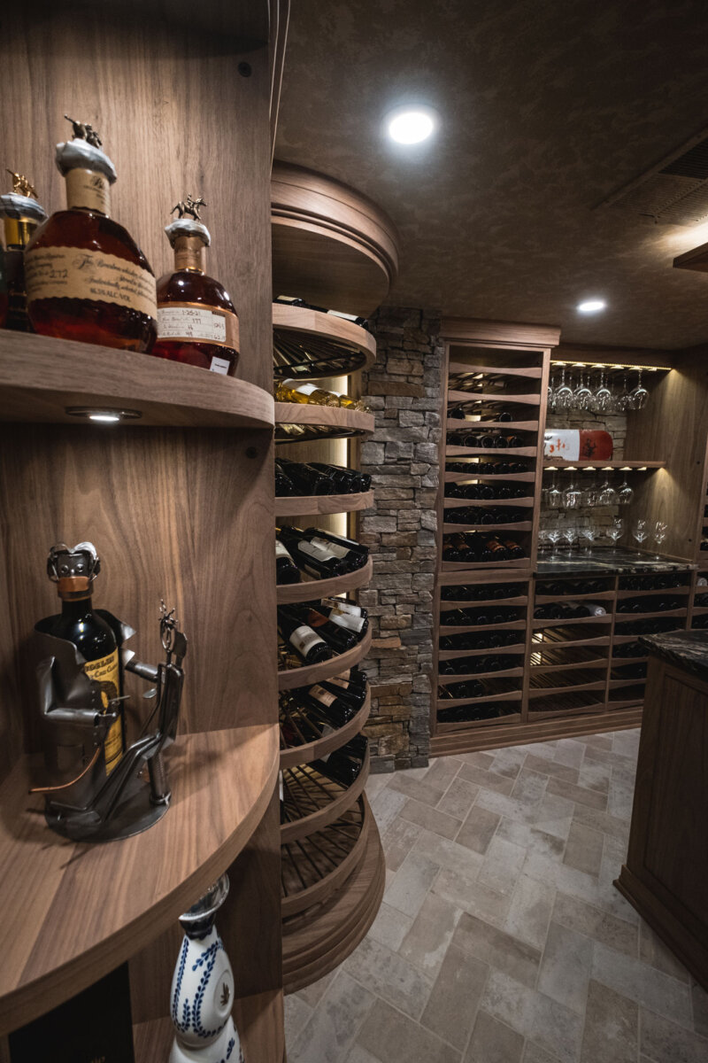 The cellar features a variety of display styles—from angled pullout drawers that keep wine in perfect contact with the cork, to eye-catching label-forward racking that highlights prized bottles. Integrated, furniture-grade shelving was also added to accommodate the homeowner’s curated collection of specialty liquors, seamlessly blending functionality with elegant design.