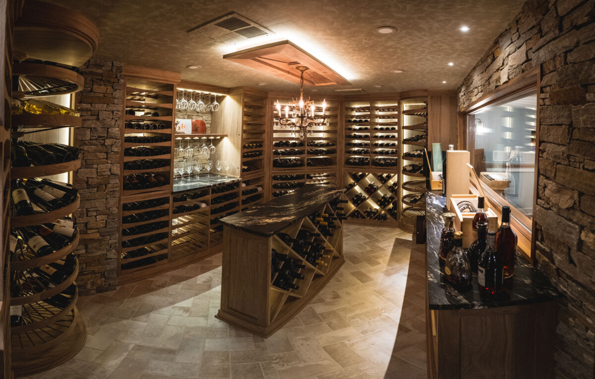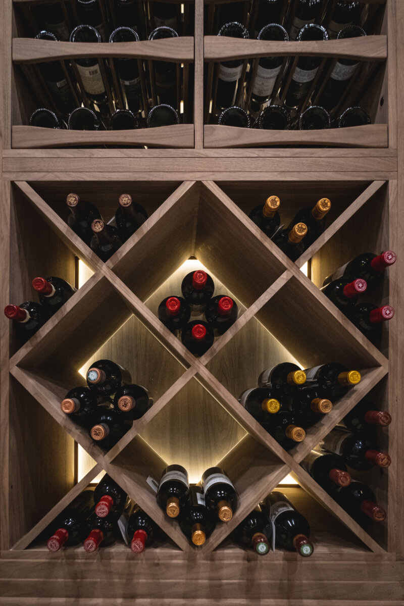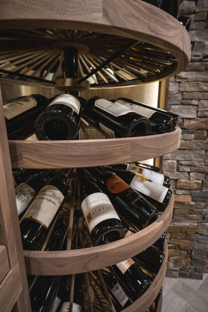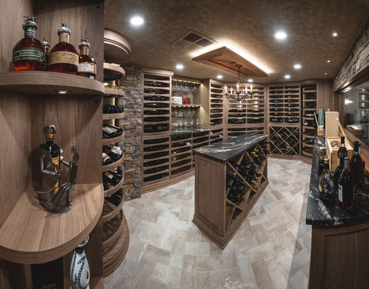 The cellar features a variety of display styles—from angled pullout drawers that keep wine in perfect contact with the cork, to eye-catching label-forward racking that highlights prized bottles. Integrated, furniture-grade shelving was also added to accommodate the homeowner’s curated collection of specialty liquors, seamlessly blending functionality with elegant design.