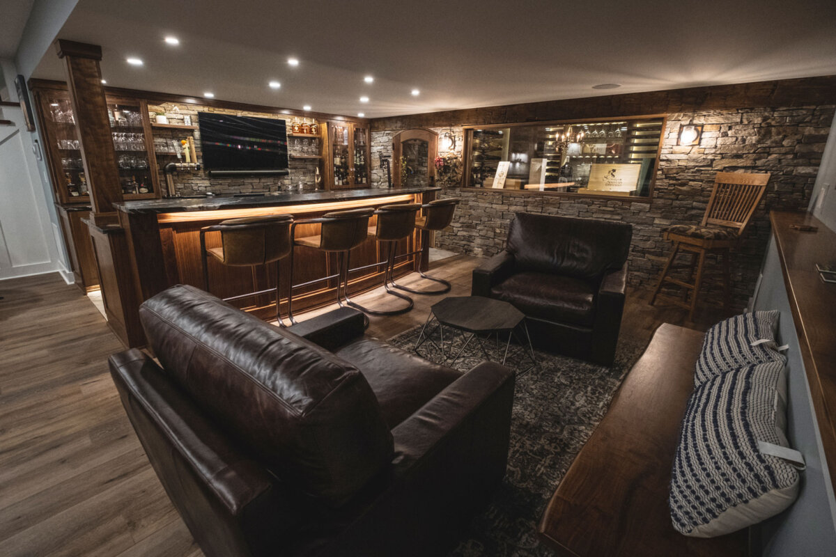 This wine cellar was designed to reflect the warmth and texture of its natural surroundings while maintaining the sleek sophistication Revel Cellars is known for. Rich walnut cabinetry anchors the space, complemented by stacked stone accents that bring an organic, lodge-inspired feel to the room.