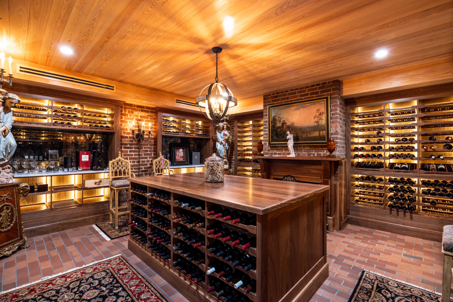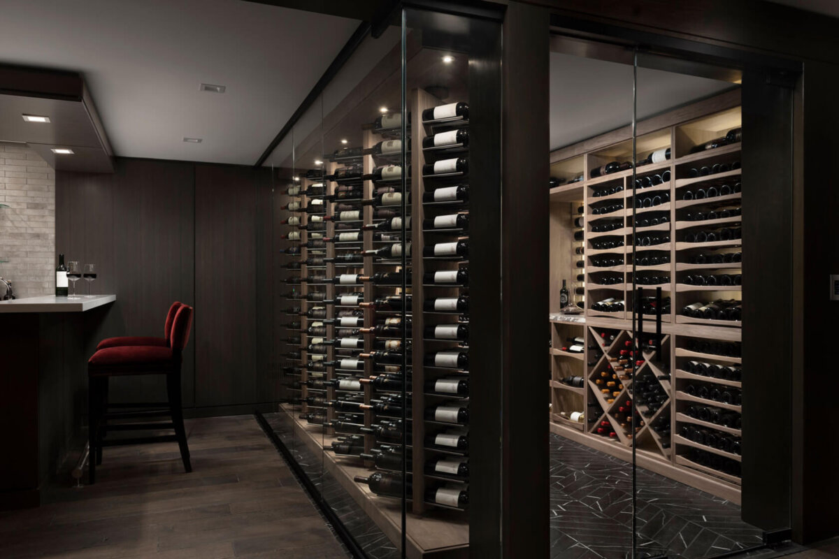 We wanted to create a space that was easy for them to host lots of guests and a space where their friends wanted to socialize. The custom cabinetry is made of natural walnut and is back-lit with integrated LED lighting. Calacatta viola stone contains merlot-colored pigments, and the floor is in a black marble-like chevron pattern that mimics the Great Room feature wall. Custom and patented wine storage solutions fill the cellar to allow maximum wine storage.
